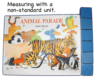 Measuring with non-standard units means measuring things with blocks, pencils, hands, feet, etc. As long as the items used to measure with are all the same size, e.g. identical blocks or brand new pencils, they are suitable to use. For example, the book below is almost six blocks long.